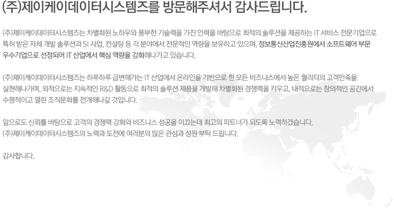 사이트맵 : (주)제이케이데이터시스템즈 홈페이지의 전체메뉴입니다.
